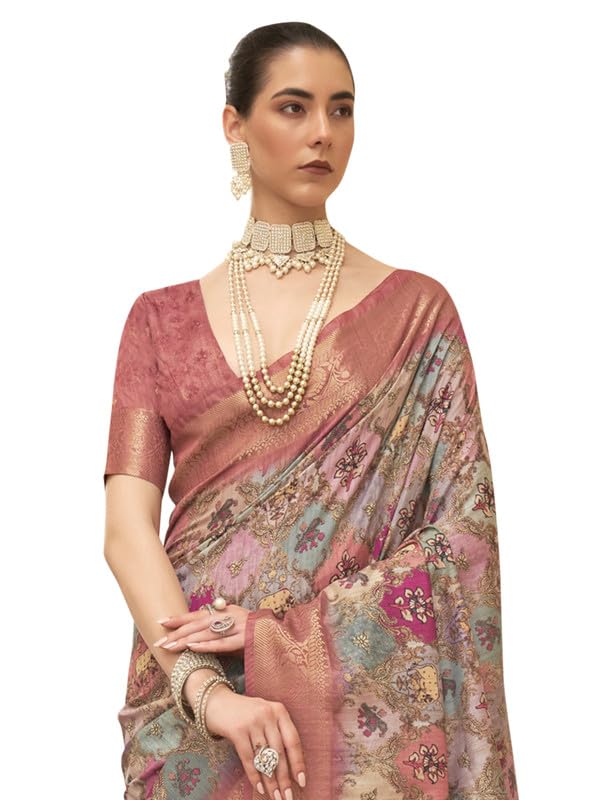 AKHILAM Women’s Tussar Silk Ethnic Motif Printed Saree With Unstitched Blouse Piece(Multicolored_ANSIKA7708_PL)