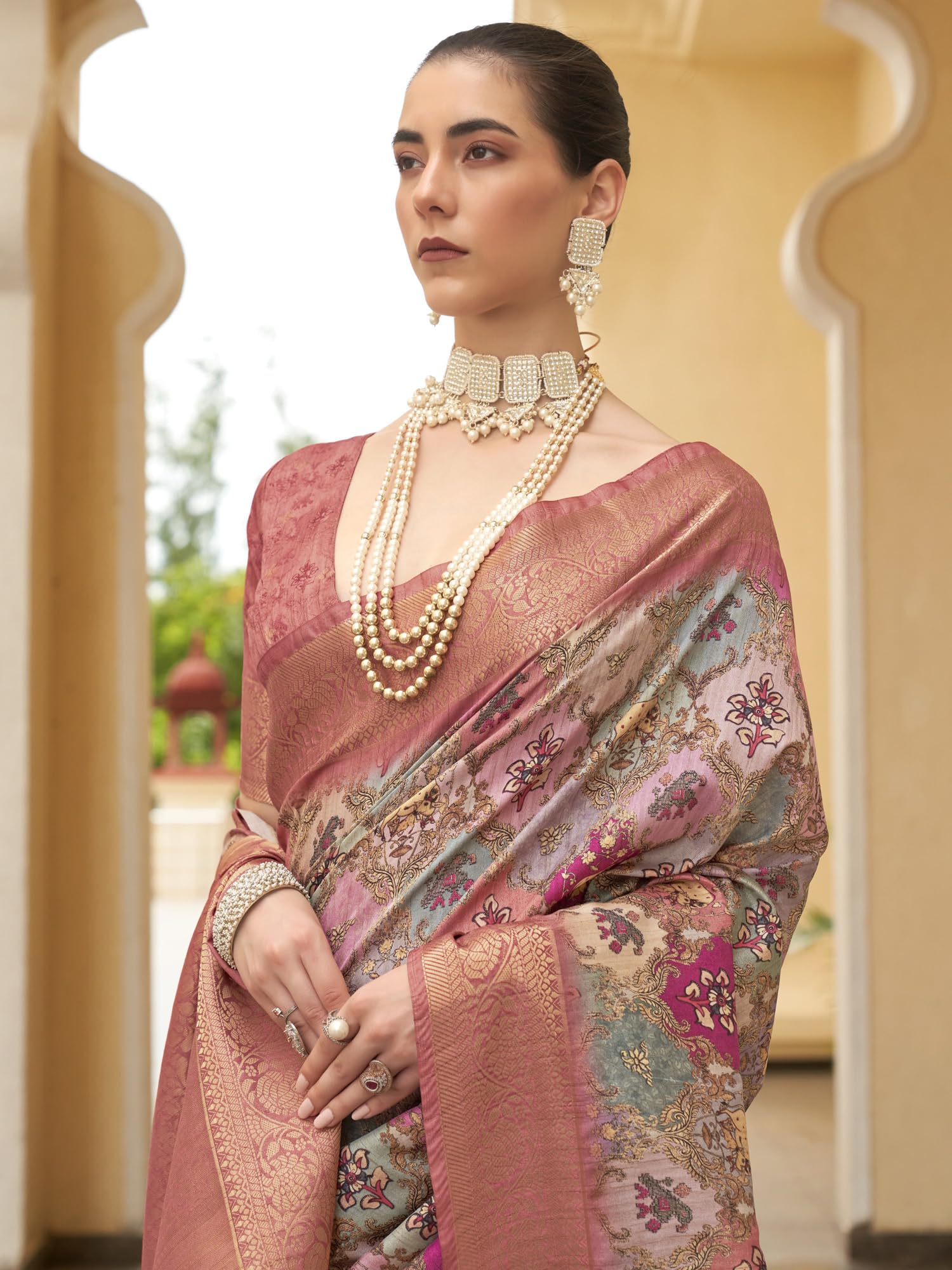 • Color: Multicolored Saree || Color: Rose Gold Blouse