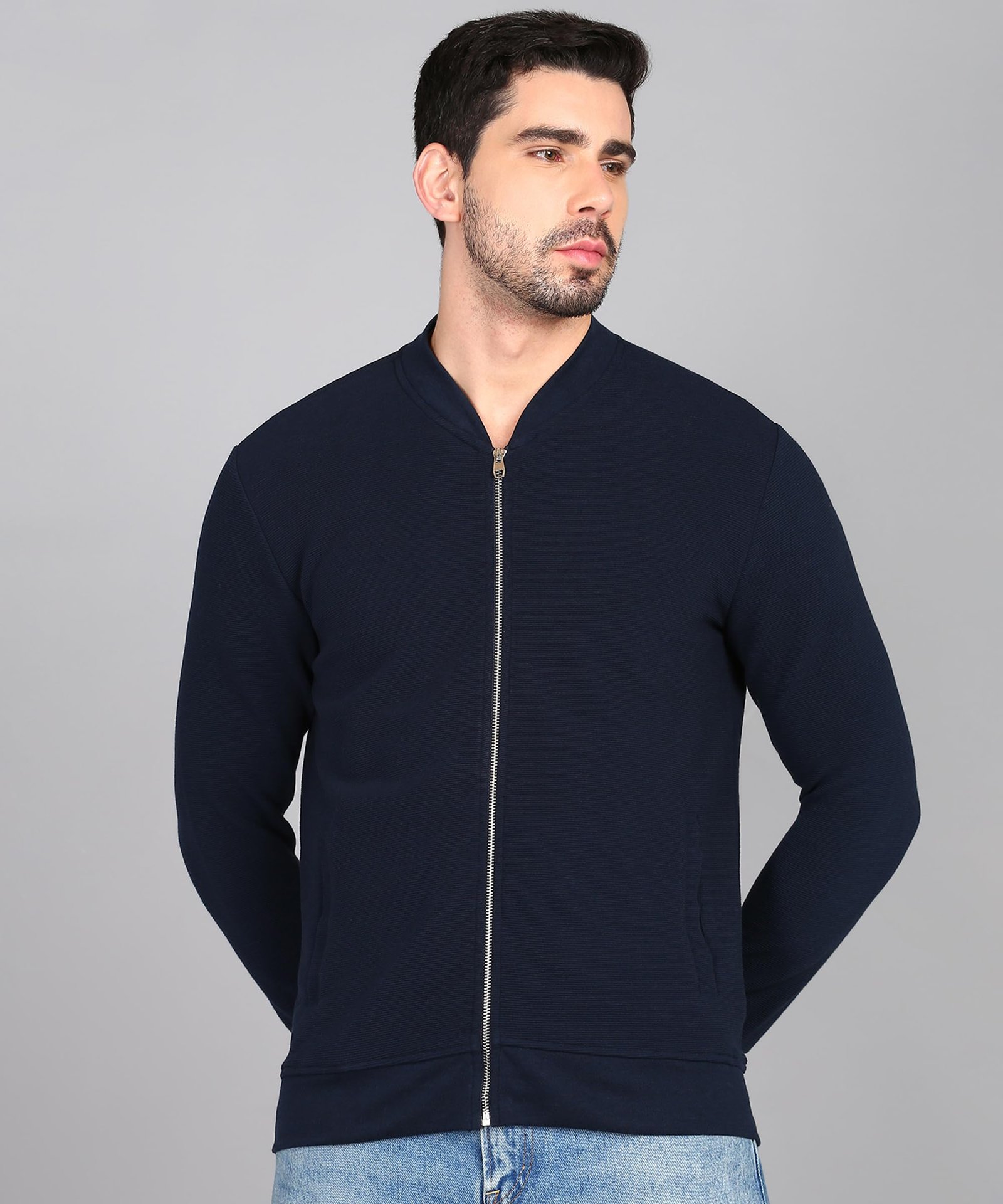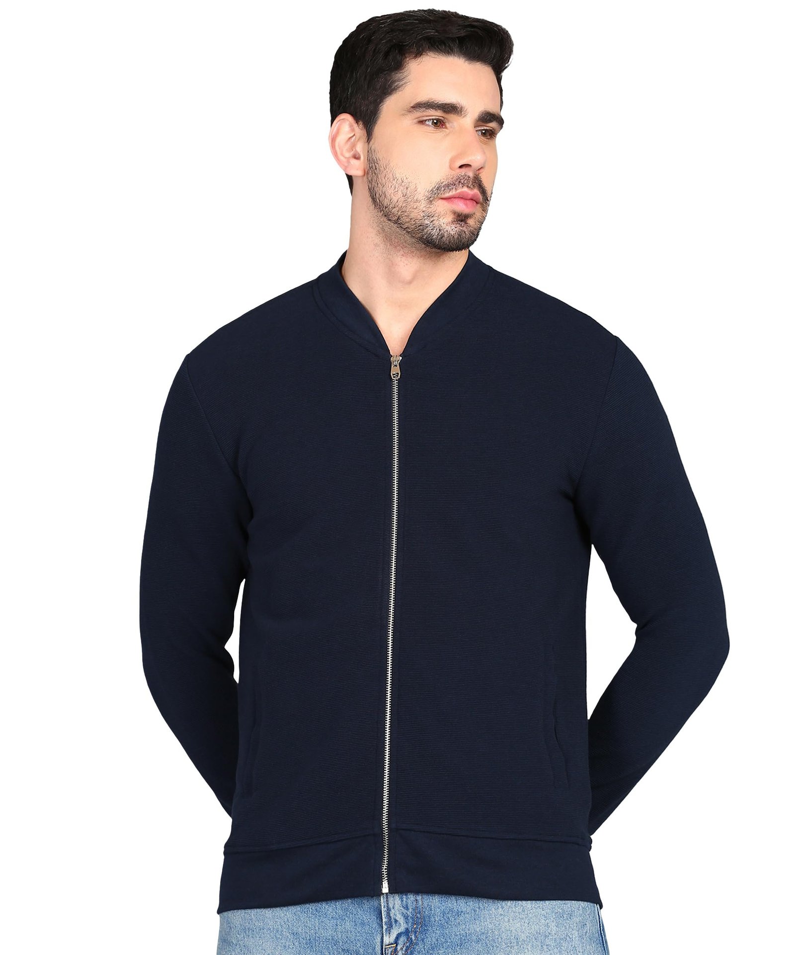 Jacket in soft, ribbed jersey with a small stand-up collar, zip down the front, side pockets and ribbing at the cuffs and hem.