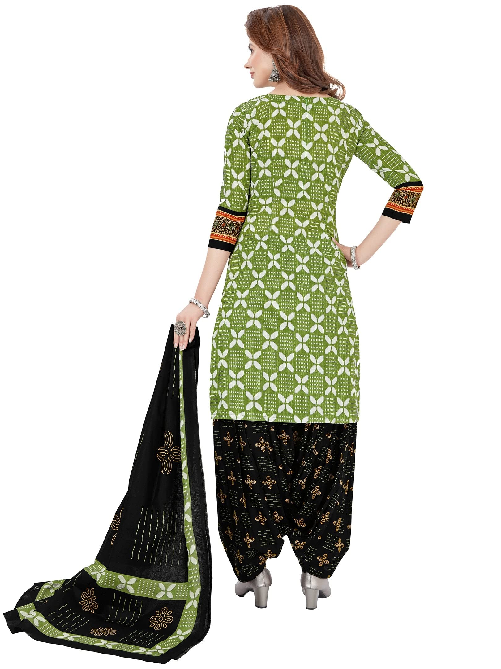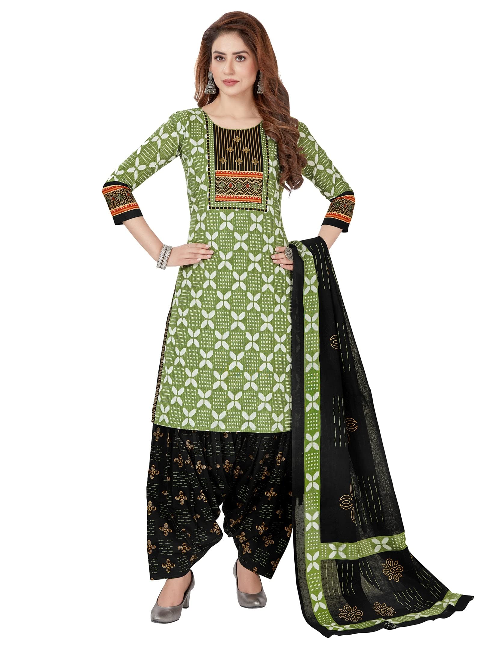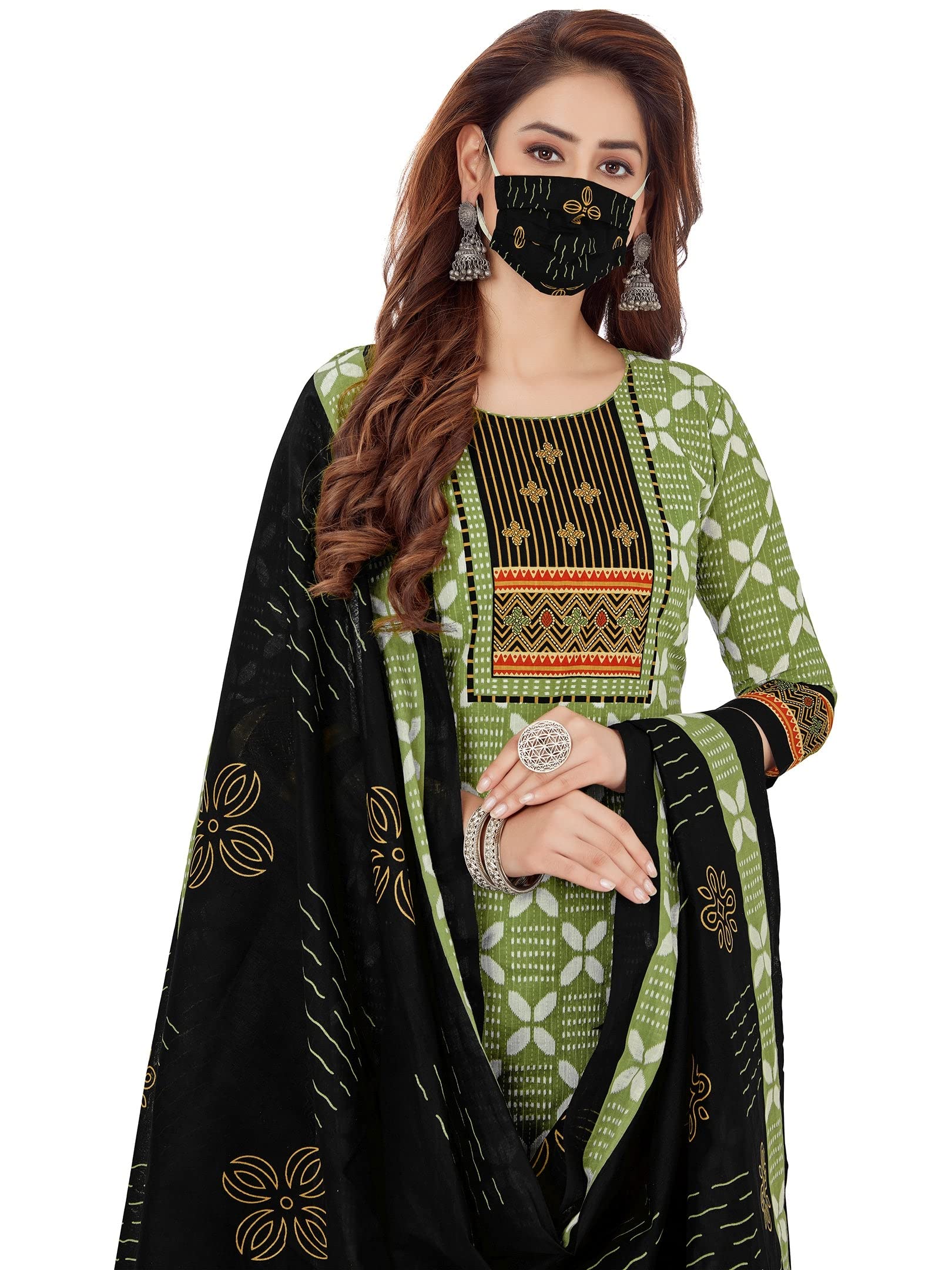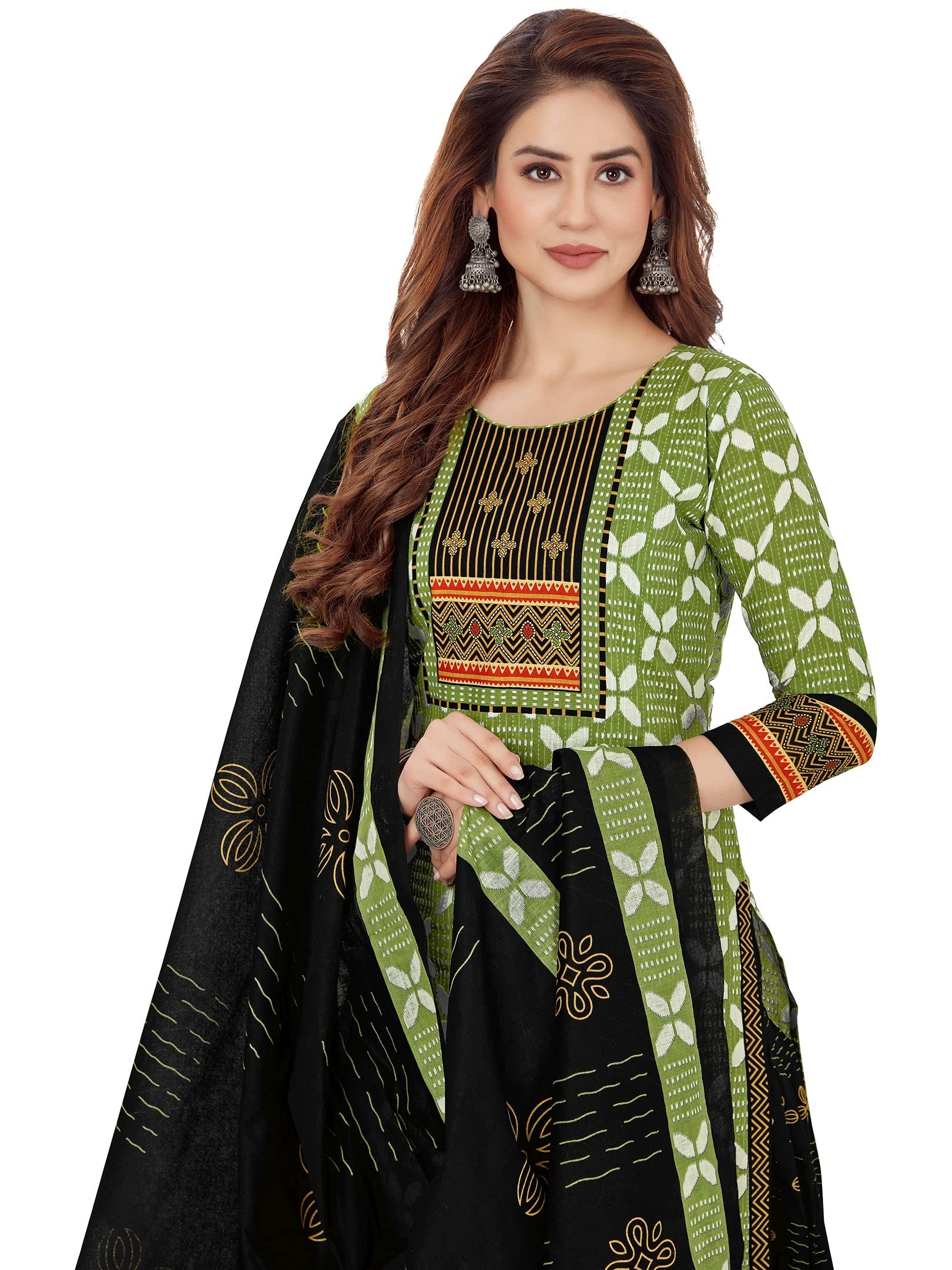 Jevi Prints Women’s Cotton Salwar Suit Set (SUIT_AP-5002_XL_Green & Black_XL)
