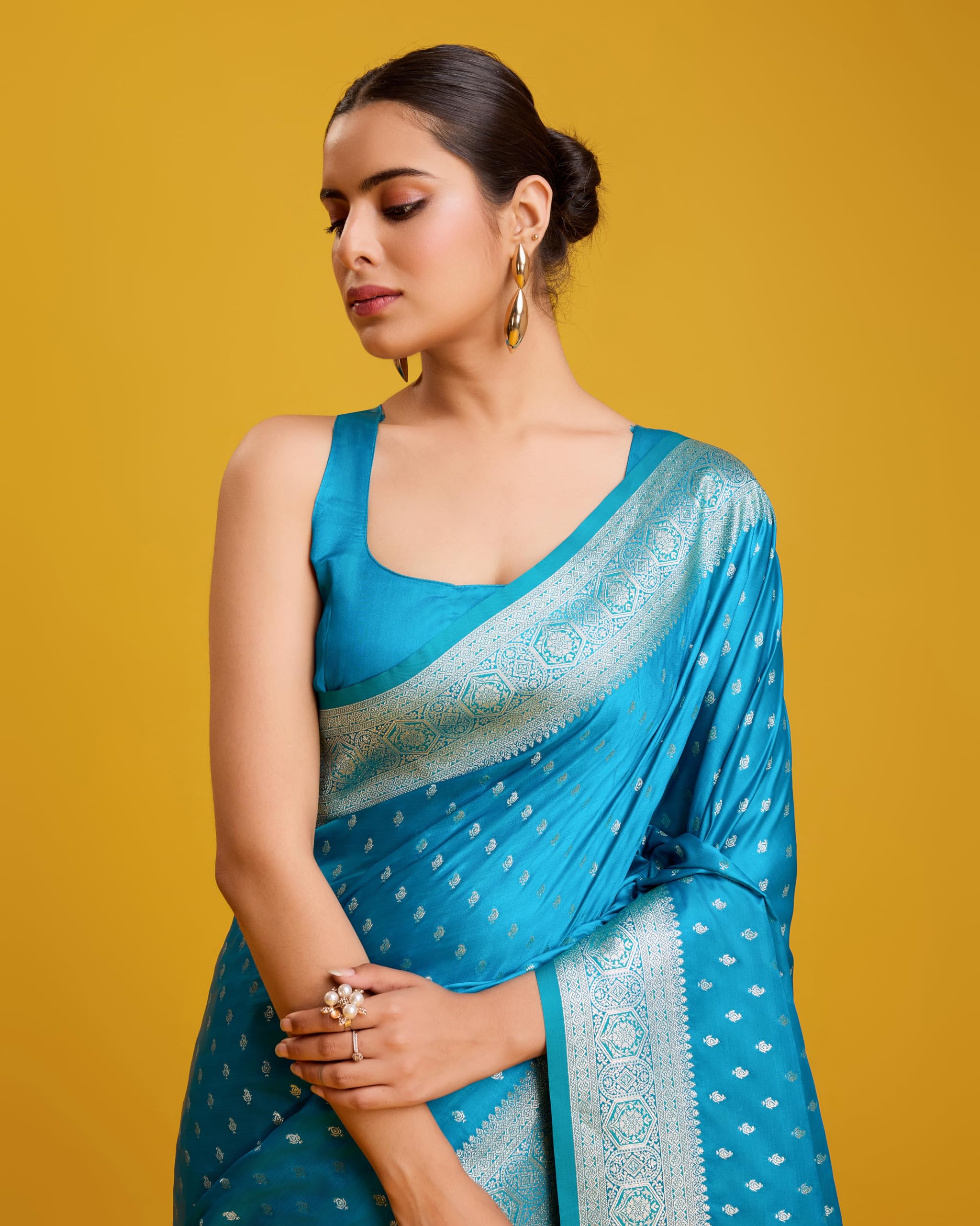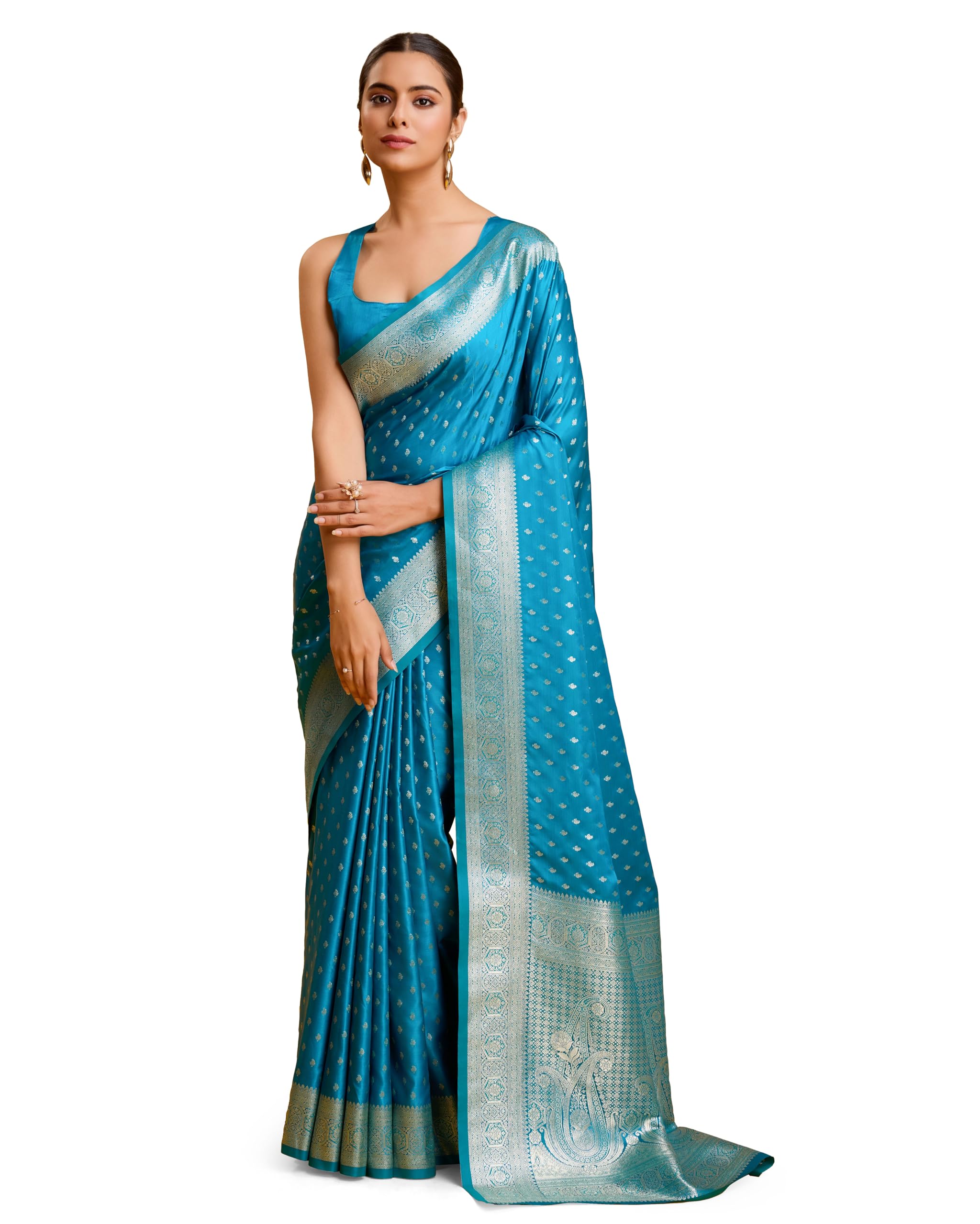 Monjolika Fashion Women’s Cyan Color Banarasi Satin Silk Saree with Zari Work Enhanced Elegance Comes With Unstitched Blouse Piece