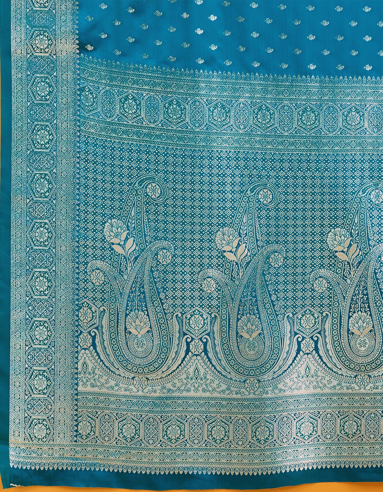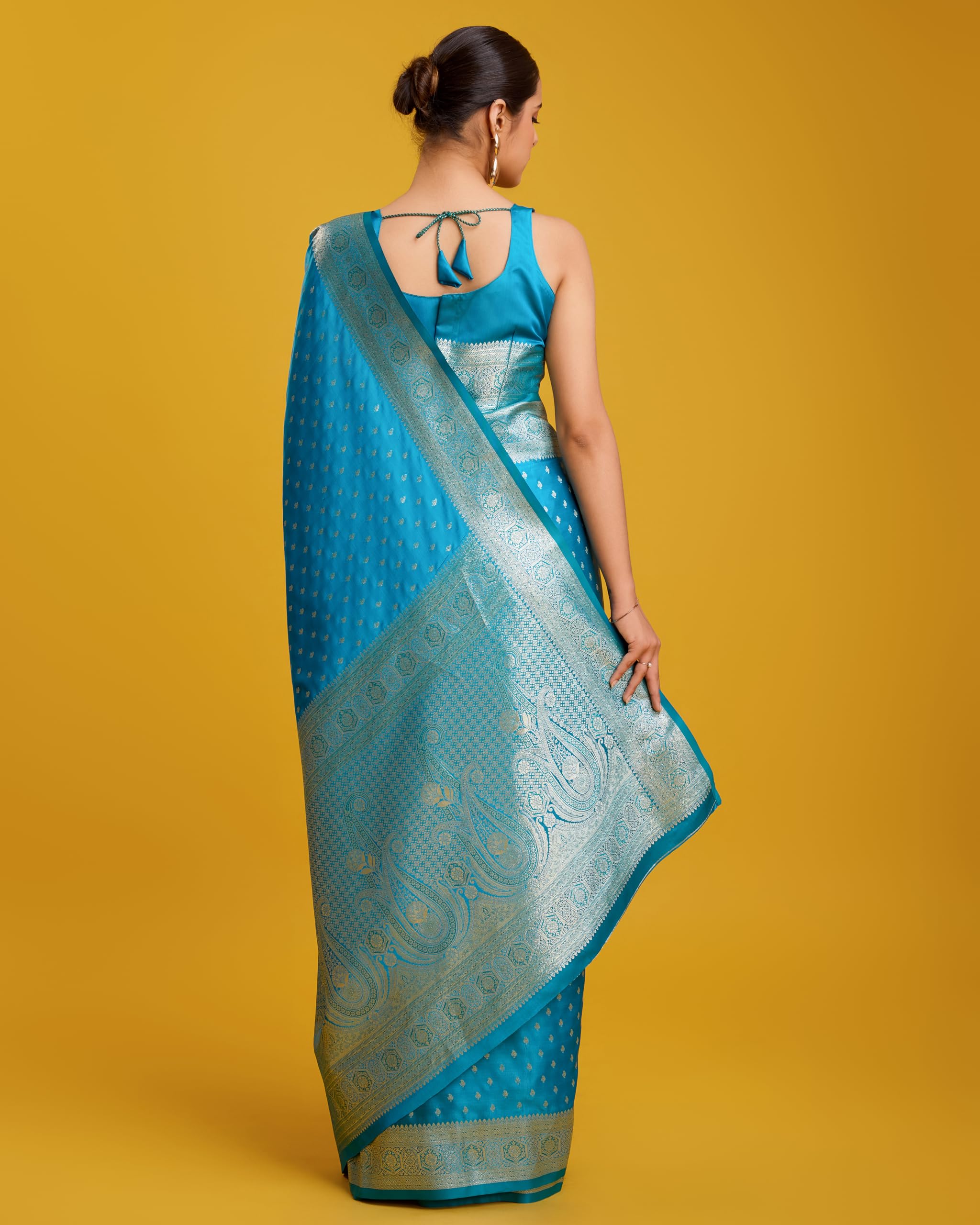 • Product Highlights : Fabric: Banarasi Satin Soft Silk (Saree & Blouse) || Work: Gold Zari Weaving (Saree), Zari Woven (Blouse) || Colour: Saree –Cyan | Blouse –Cyan|| Traditional Banarasi weaving with intricate zari work.