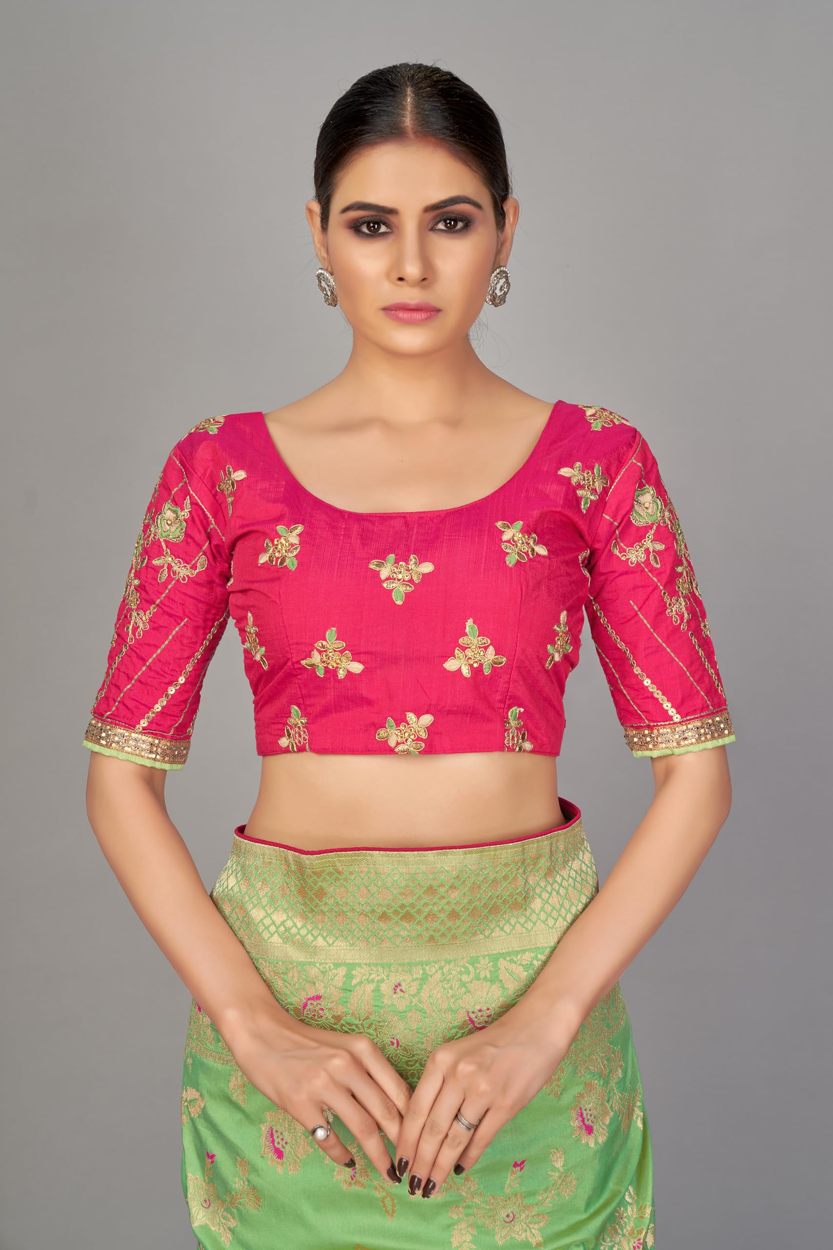 - Product Highlights : Fabric: Banarasi Silk Blend (Saree), Art Silk (Blouse) || Work: Zari Woven (Saree), Zari Embroidery (Blouse) || Colour: Saree –Light Green | Blouse – Pink || This Banarasi silk saree is intricately woven with zari detailing.