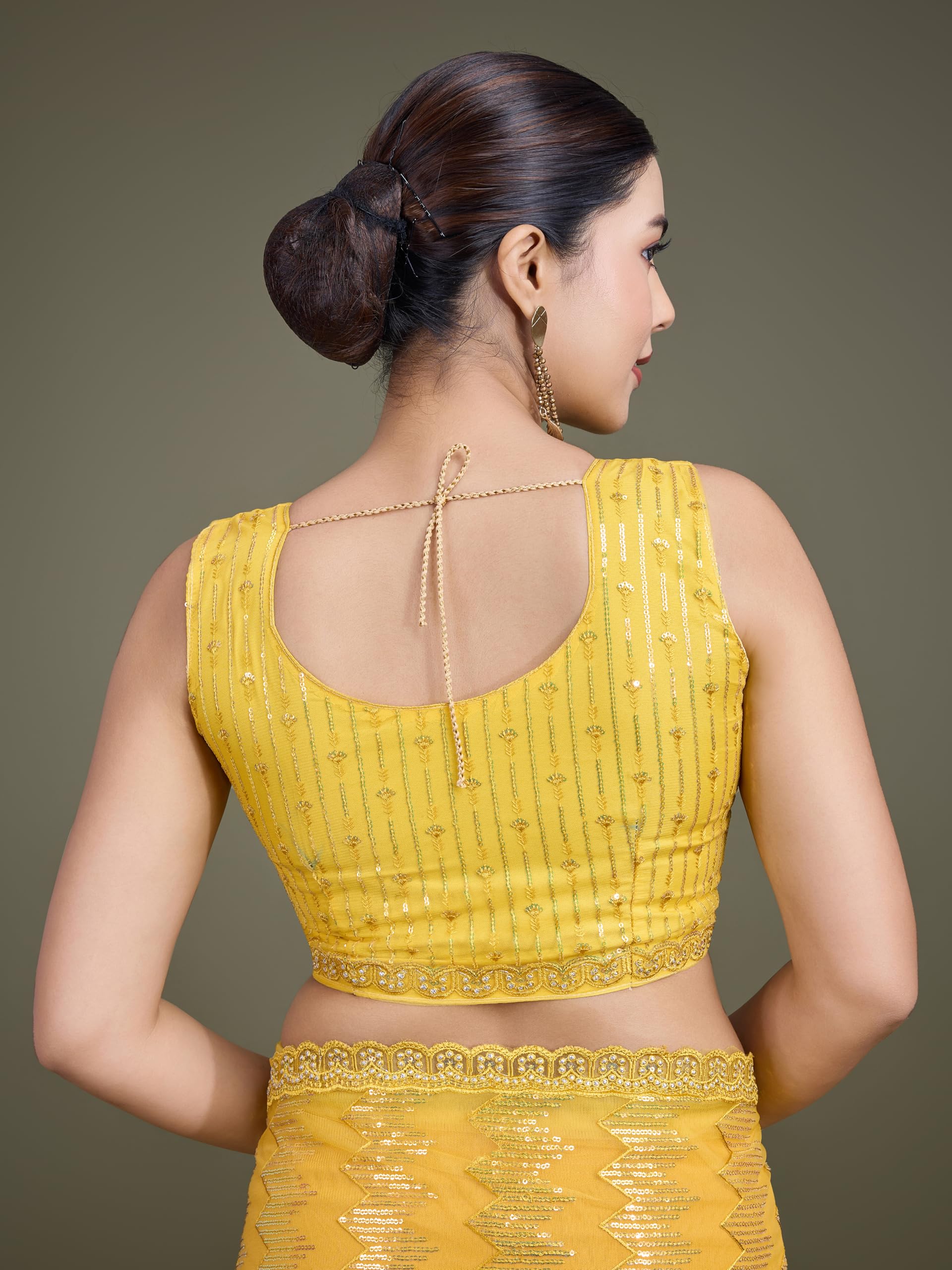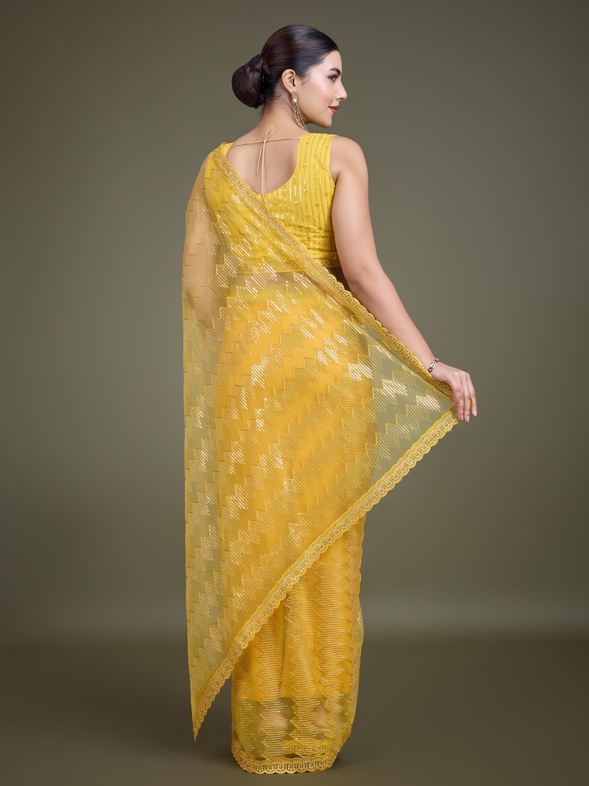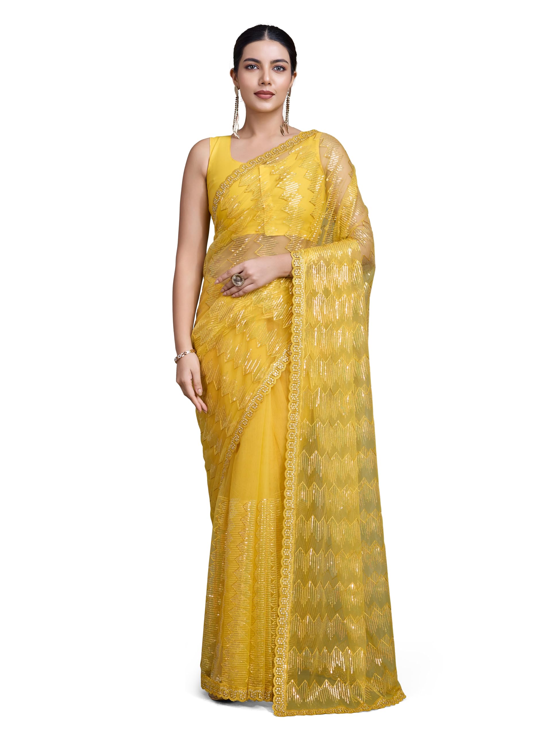 Monjolika Fashion Women’s Yellow Color Sequence Work Net Saree Comes with Unstitched Blouse piece