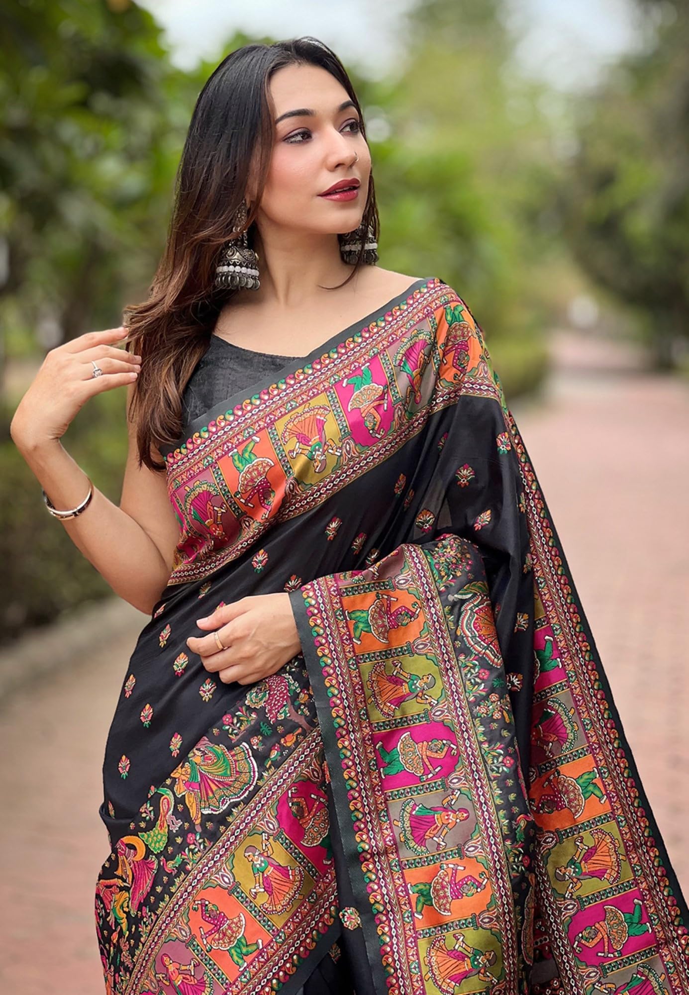 Pandadi Saree Women’s Balck Pashmina Kashmiri Silk Saree With Unstitched Blouse Piece