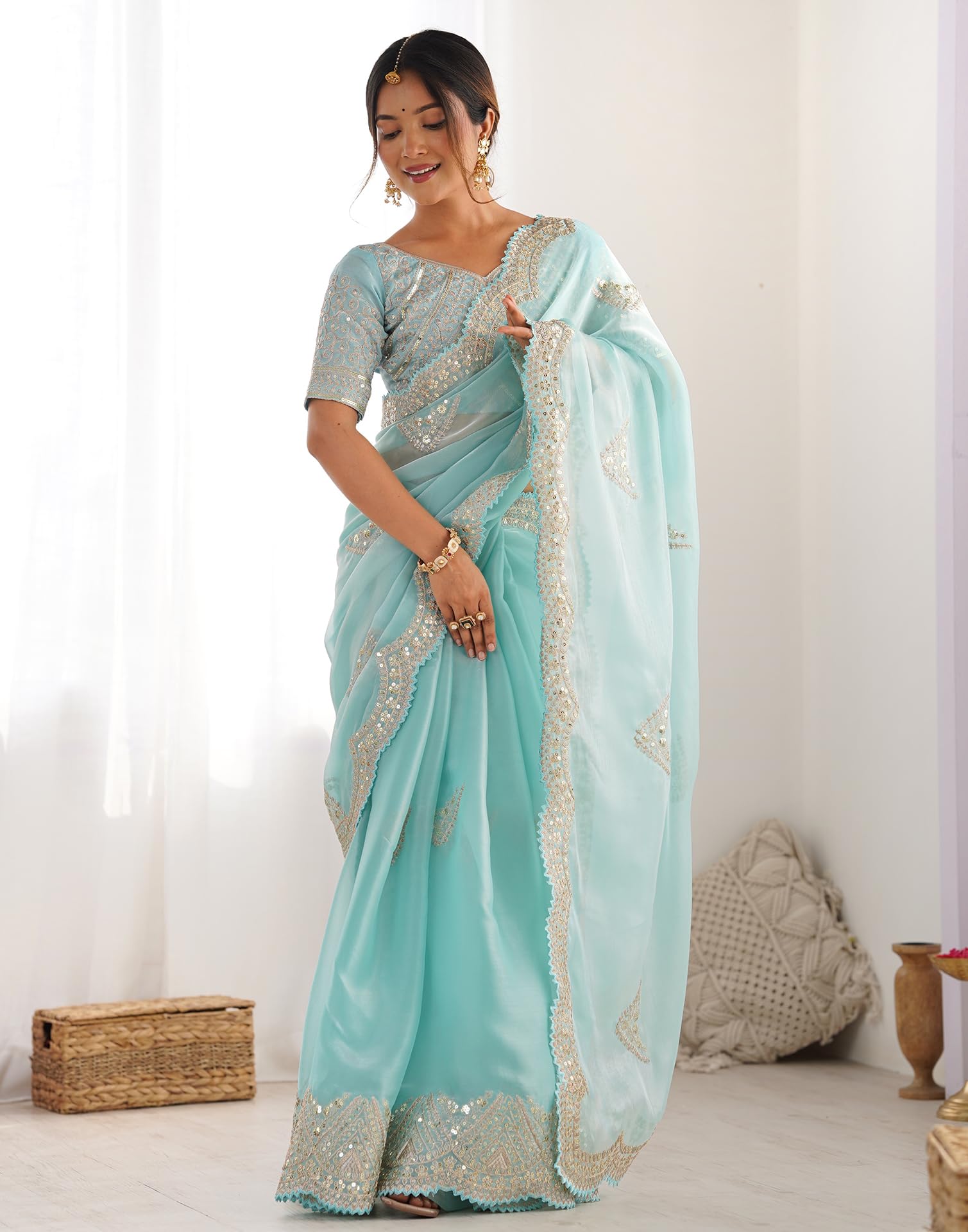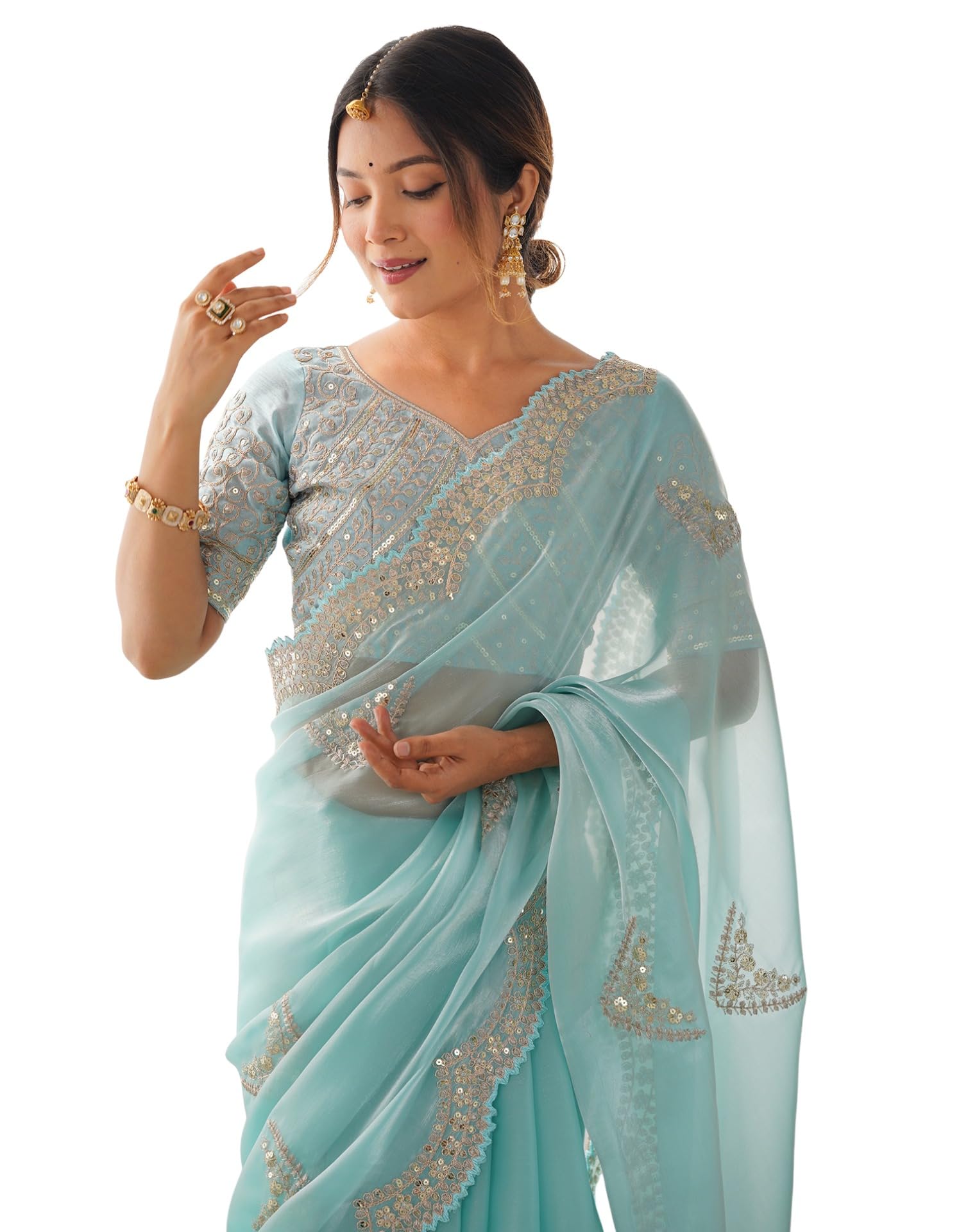 SIRIL Women’s Organza Sequence Embroidery Scollped Border Saree with Unstitched blouse Piece (4218S6636_Blue)