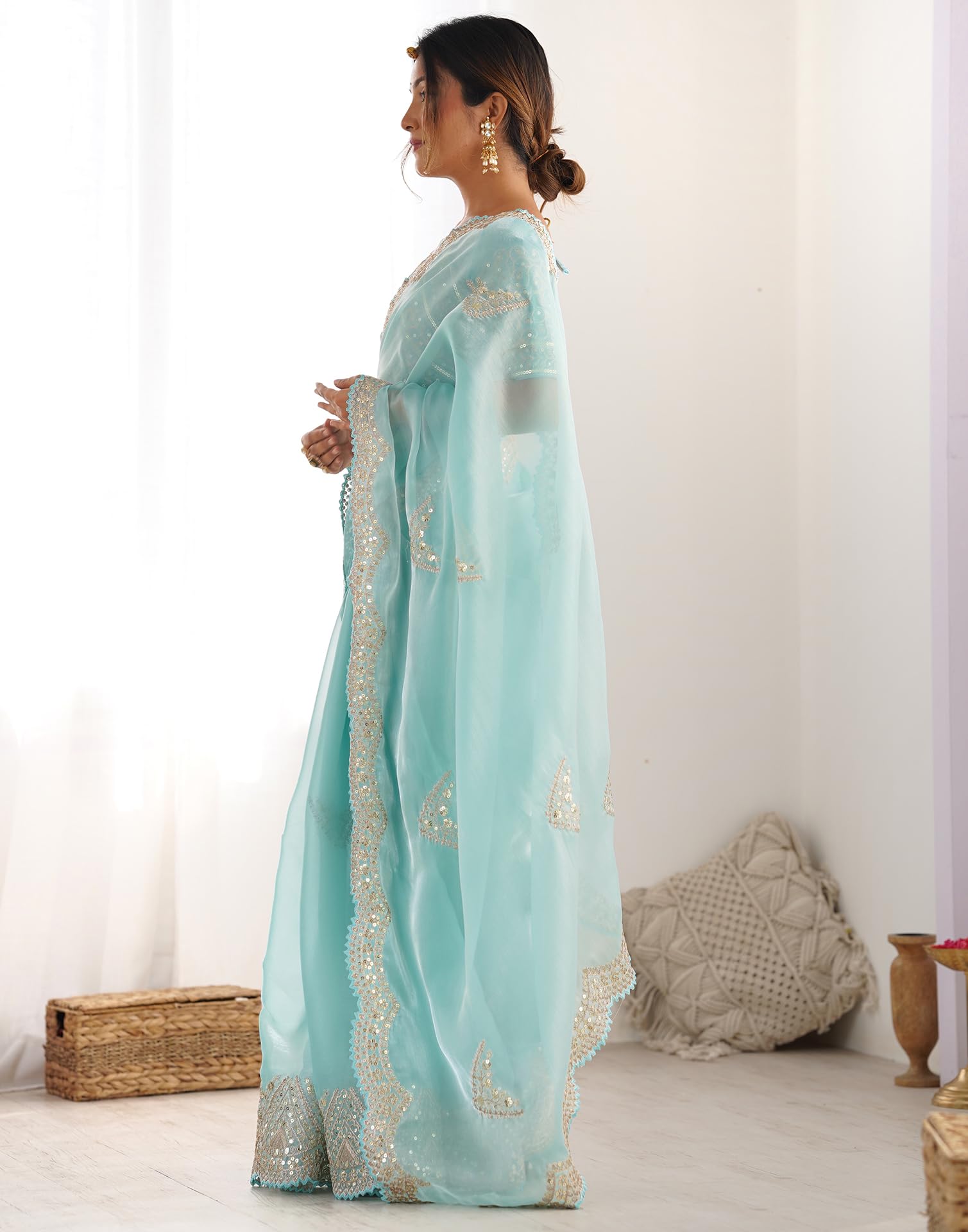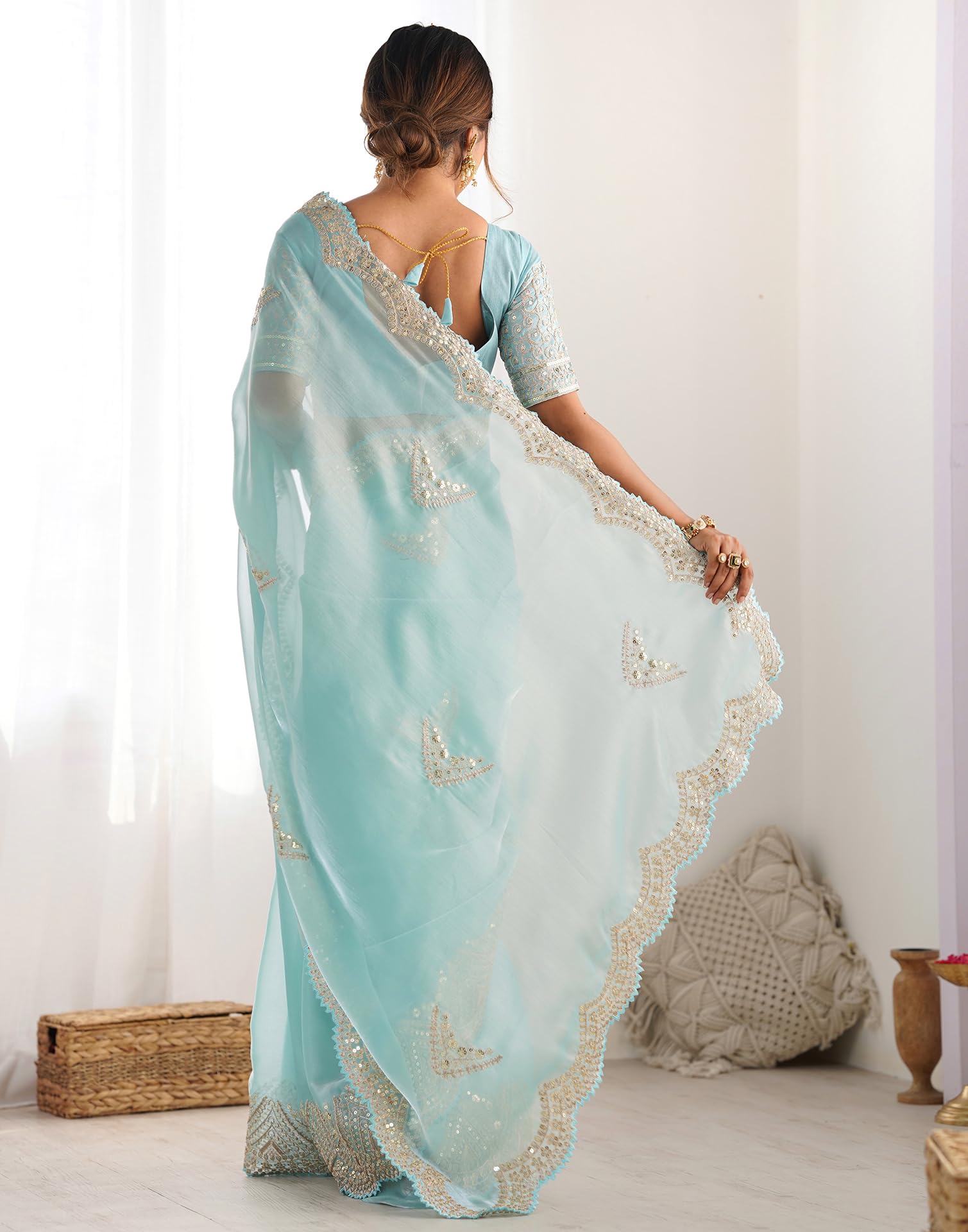 • Saree Details : Saree Fabric: Organza | Blouse Fabric: Bhagalpuri Silk | Saree Work: Sequence Embroidery, Scollped Border | Blouse Work: Dyed, Sequin Embroidery | Saree Color: Black | Blouse Color: Black