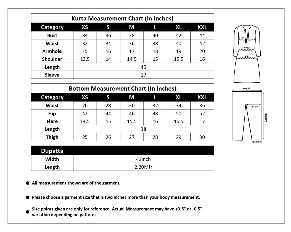 - Size details : kurta length: 45inch| kurta sleeves: 17inch | kurta bust: 38inch | dupatta length: 2.20Mtr | pant waist: 30inch | pant length: 38inch | pant hip: 46inch