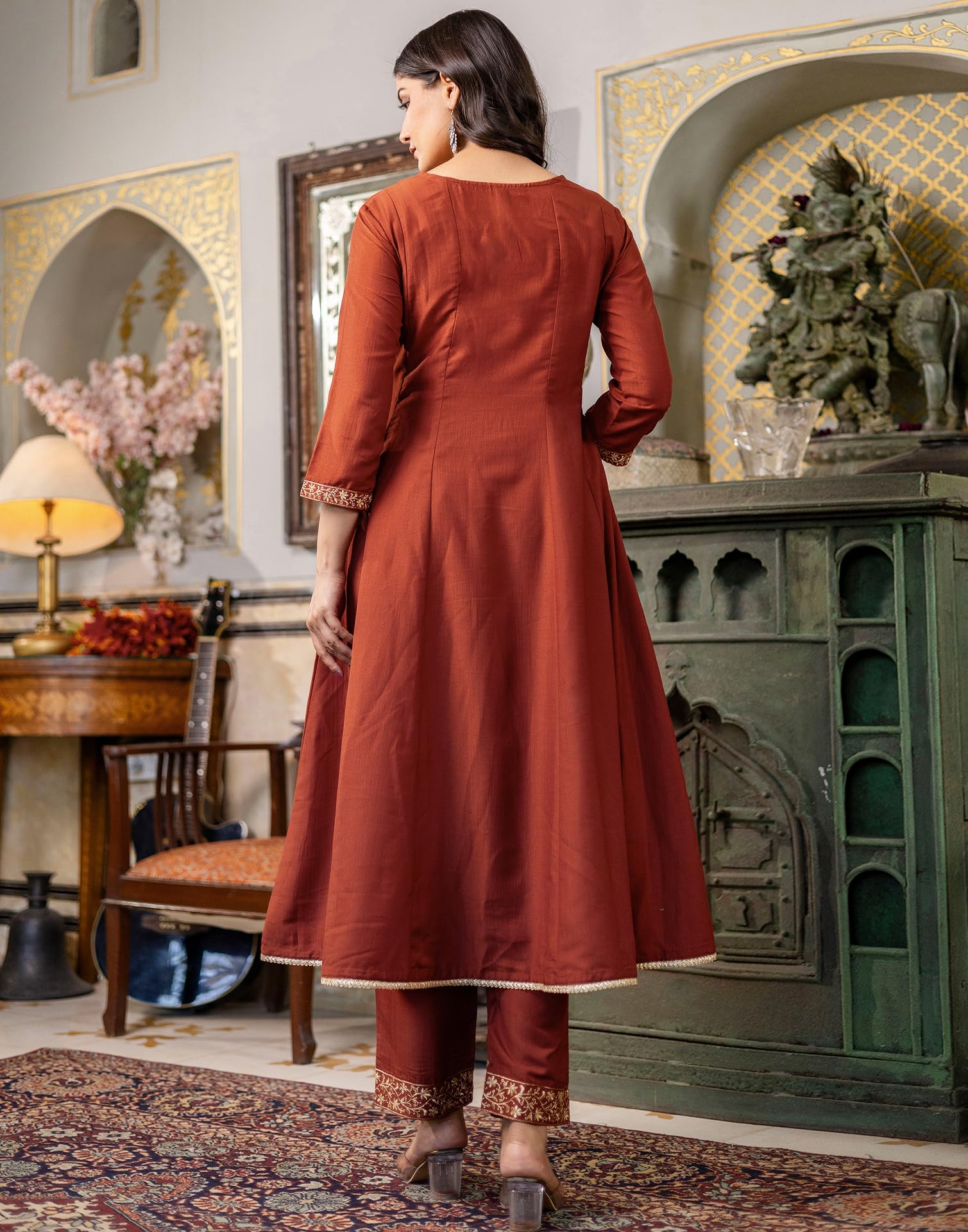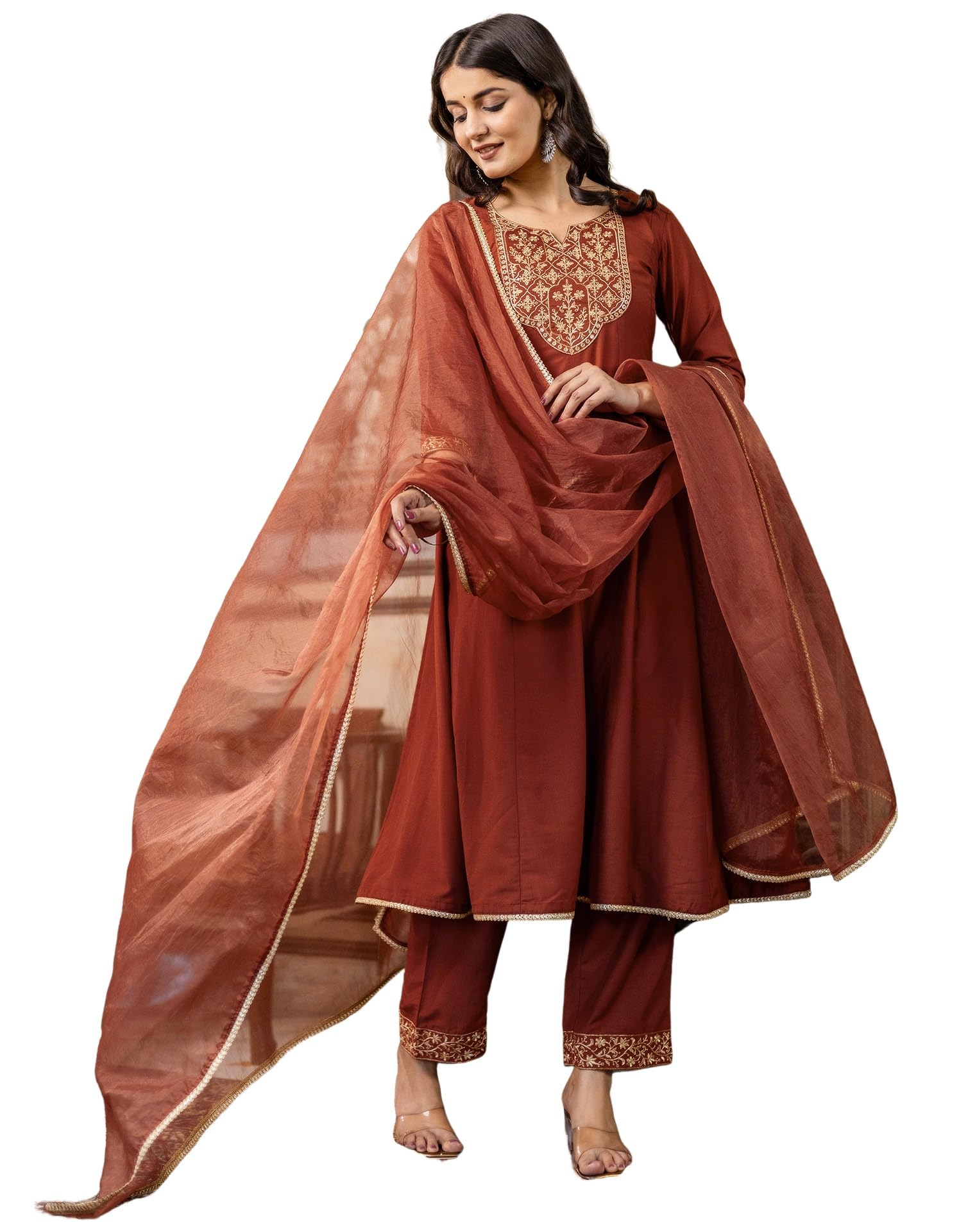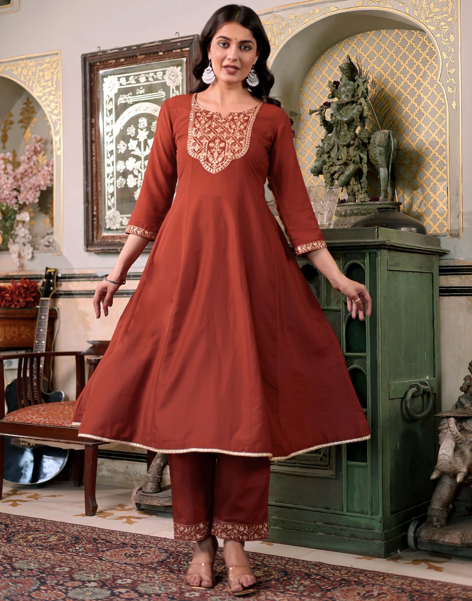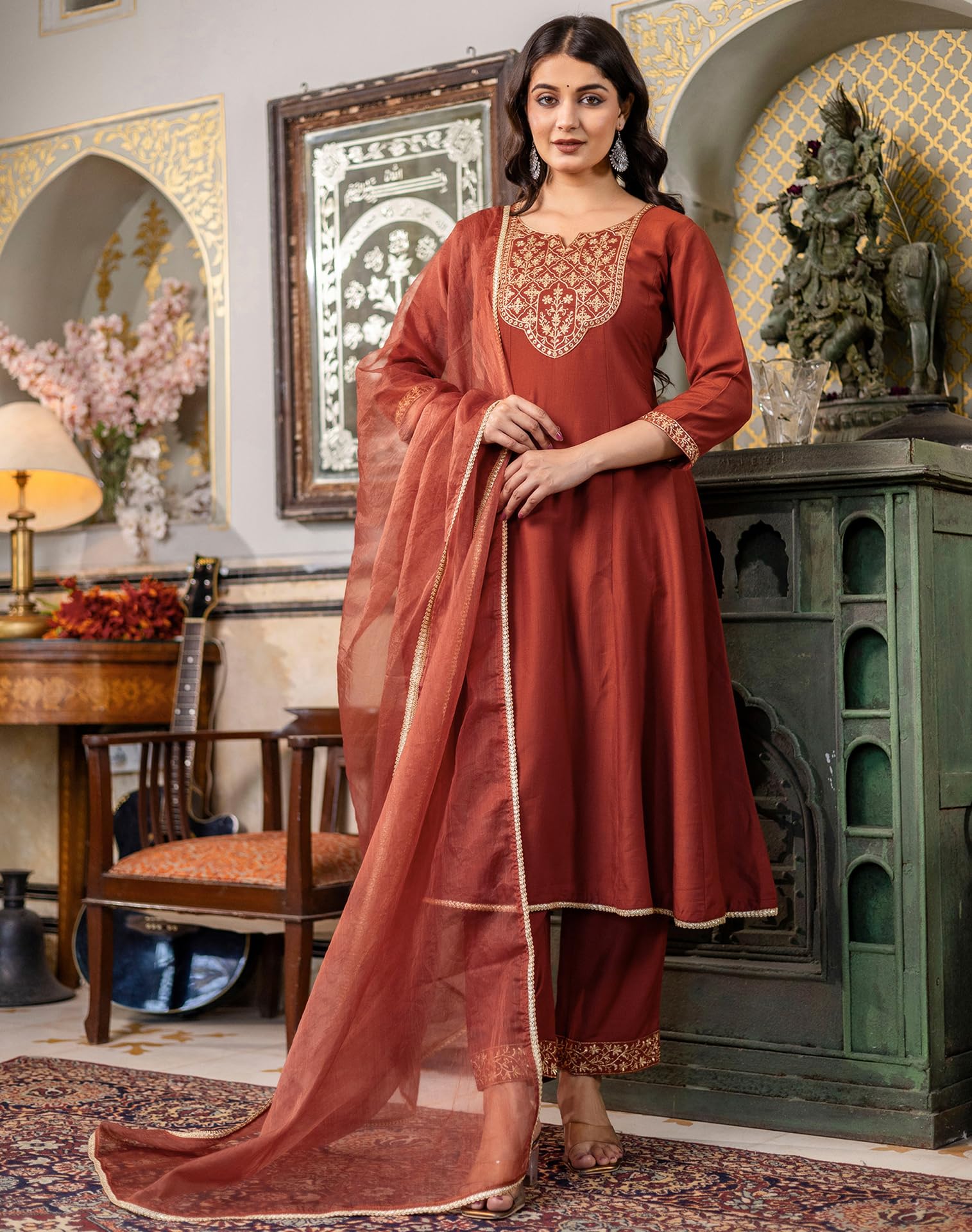 - Kurta set details : kurta fabric: Cotton Silk | kurta work: Embroidery And Sequins Work, Embroidery Lace | pant fabric: Chinnon | pant work: Embroidery Lace (With Pocket) | dupatta fabric: Organza| dupatta work: Lace | kurta color: Rust Brown || pant color: Rust Brown || dupatta color: Rust Brown