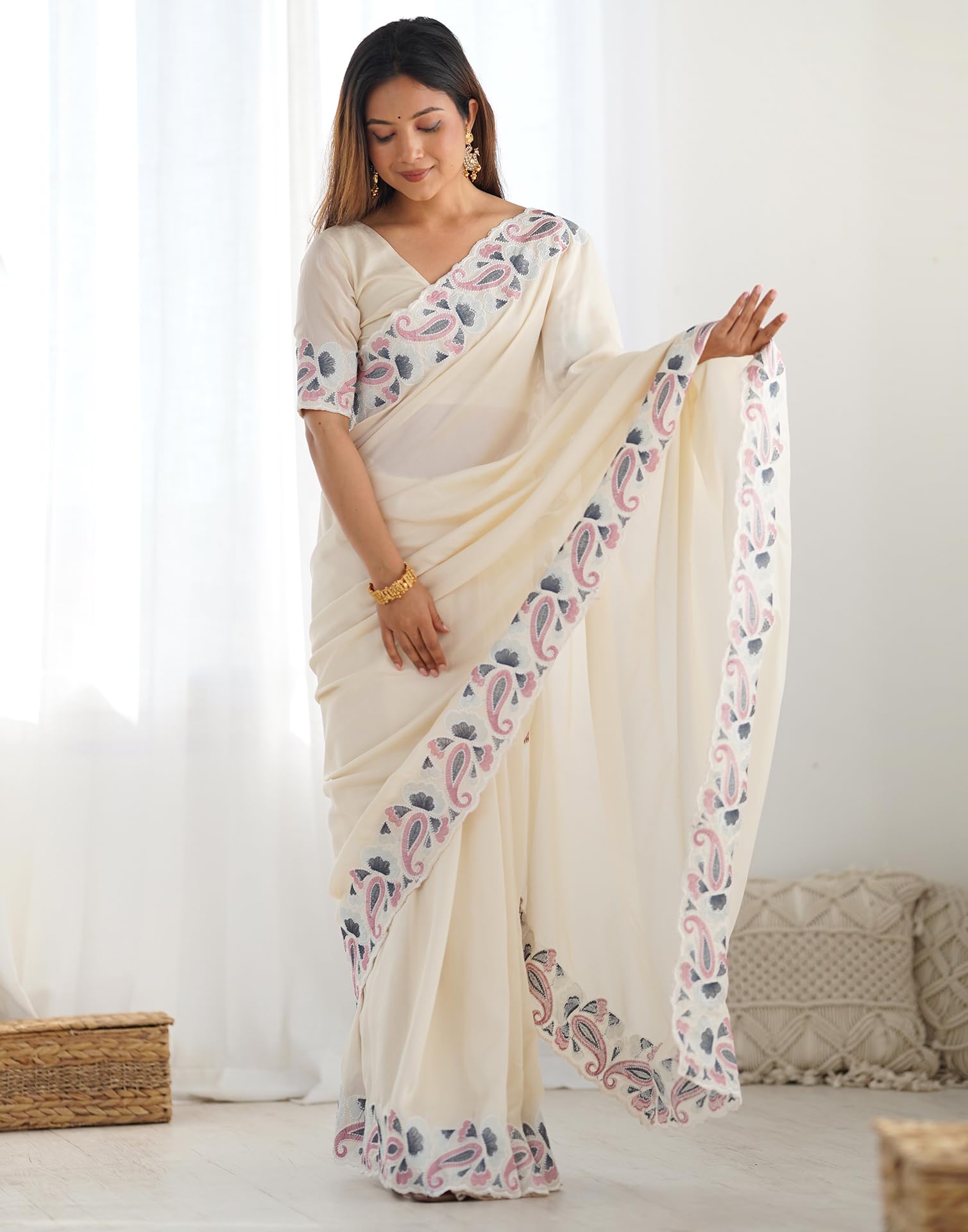 • Saree Fabric: Silk Blend | Blouse Fabric: Silk Blend | Work:: Saree: Embroidery Scalloped Border | Blouse: Embroidery