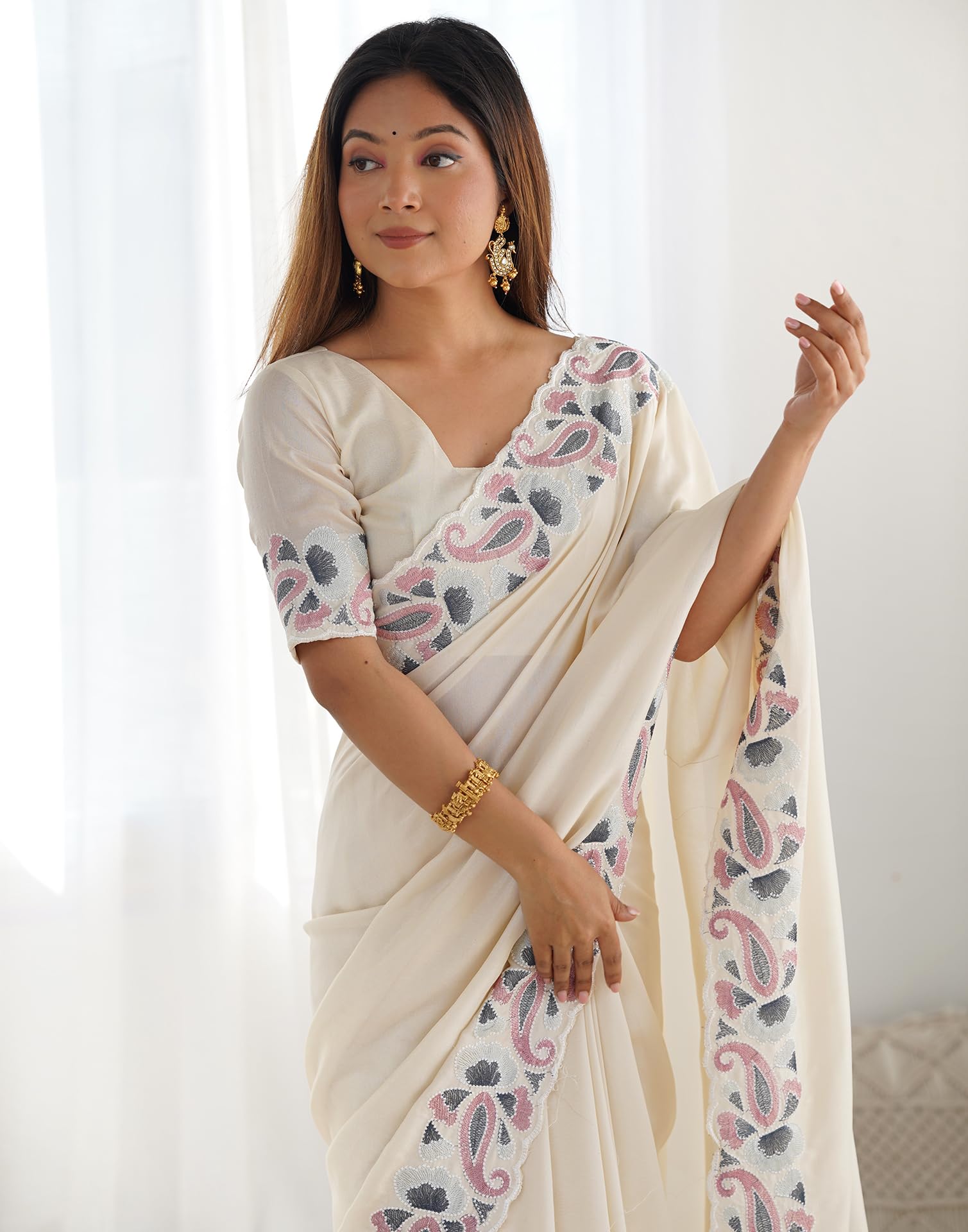 SIRIL Women’s Silk Blend Embroidery Scalloped Border Saree with Unstitched blouse Piece for Wedding and Parties (4135S146_Ivory)