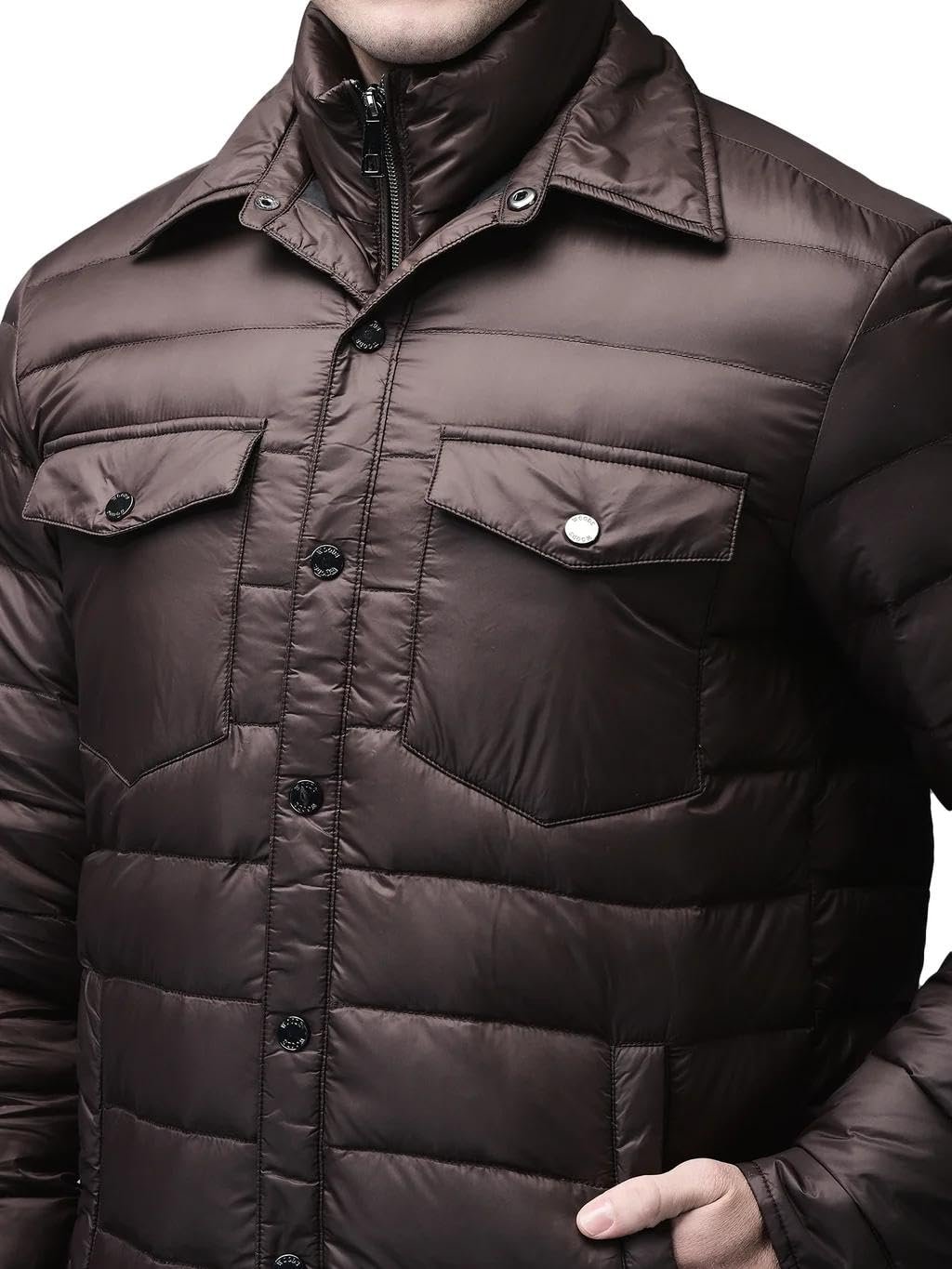 Woods Men’s Dark Brown Solid Shirt Collar Double-Layer Quilted Nylon Winter Coat with Front Button Closure, Zip-Up Inner Layer, Flap Pockets | L | Dbrown