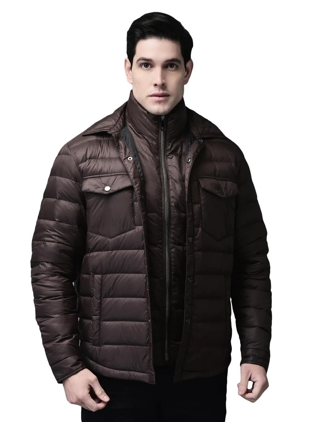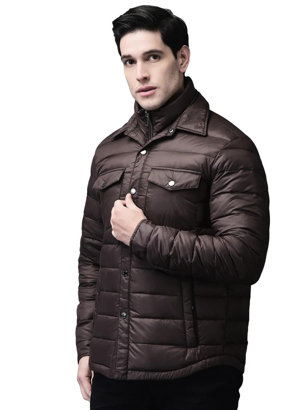 HomeMenJacketsWoods Men’s Dark Brown Solid Shirt Collar Double-Layer Quilted Nylon Winter Coat with Front Button Closure, Zip-Up Inner Layer, Flap Pockets | L | Dbrown